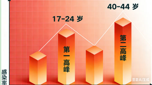 第一个高峰:17-24岁第二个高峰:40-44岁